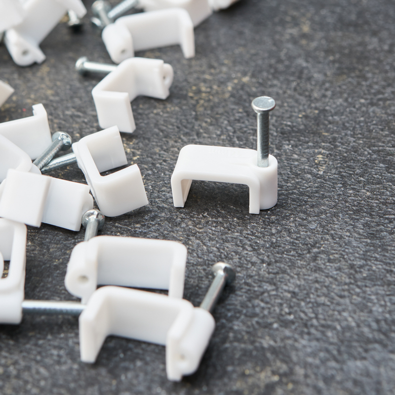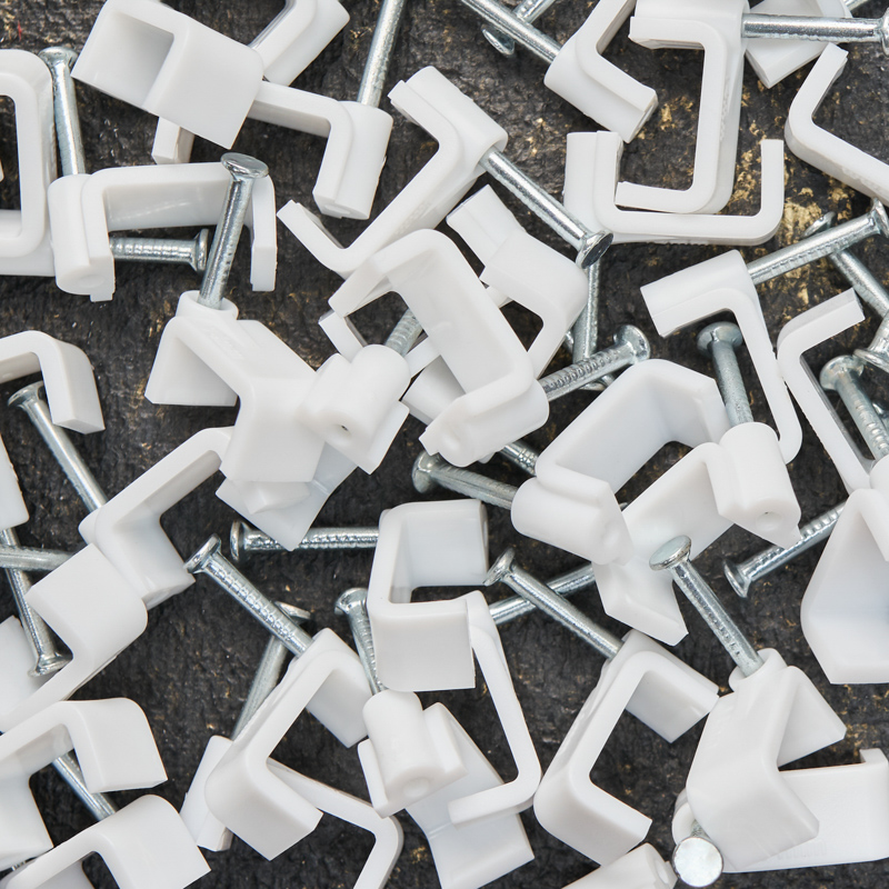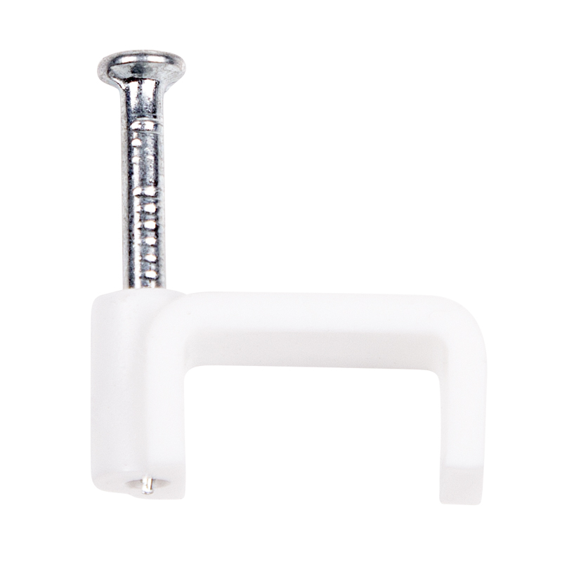 Представляет собой выполненную из качественного пластика П-образную скобу белого цвета, в монтажное отверстие которой уже вставлен гвоздь. Скоба используется для мгновенного и надежного крепления проводов и кабелей к поверхностям стен, несущих конструкций и потолков. Гвоздь выполнен из закаленной стали, что позволяет закрепить его даже в плотной и твердой древесине без риска погнуть или сломать.