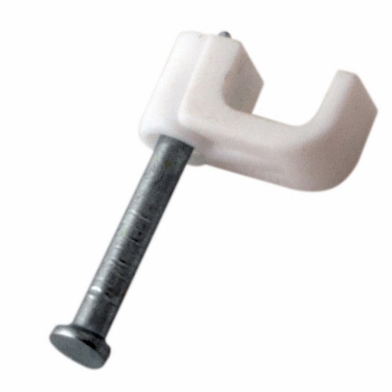 Представляет собой выполненную из качественного пластика П-образную скобу белого цвета, в монтажное отверстие которой уже вставлен гвоздь. Скоба используется для мгновенного и надежного крепления проводов и кабелей к поверхностям стен, несущих конструкций и потолков. Гвоздь выполнен из закаленной стали, что позволяет закрепить его даже в плотной и твердой древесине без риска погнуть или сломать.
