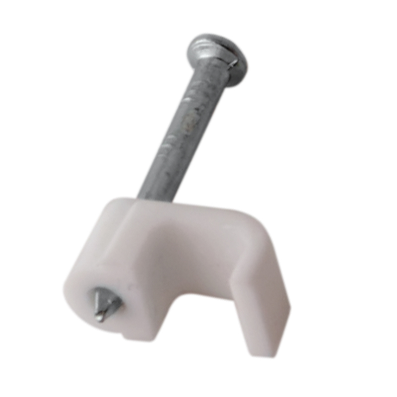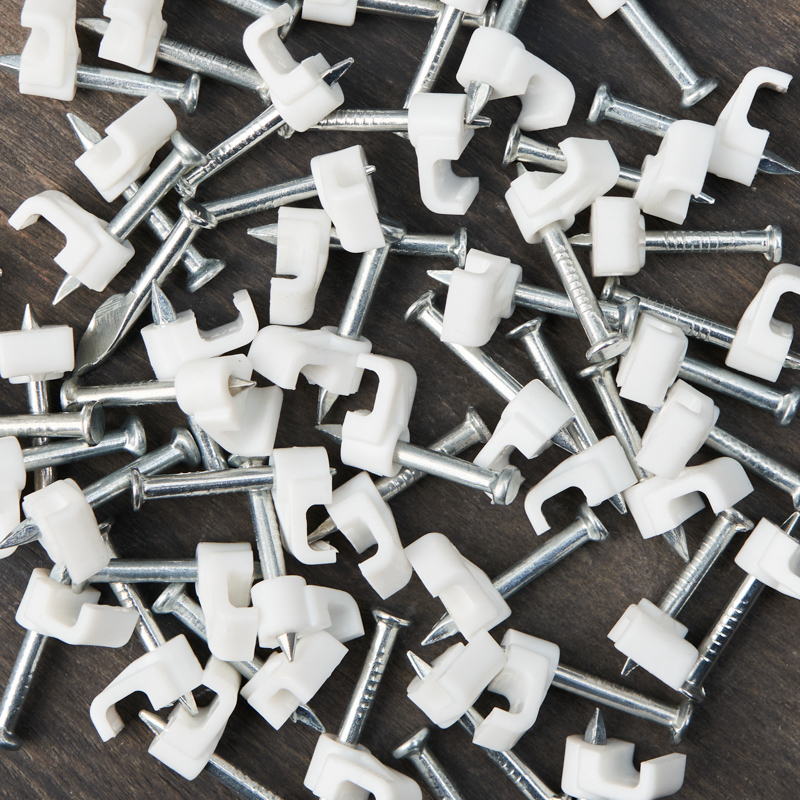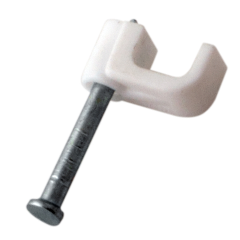 Представляет собой выполненную из качественного пластика П-образную скобу белого цвета, в монтажное отверстие которой уже вставлен гвоздь. Скоба используется для мгновенного и надежного крепления проводов и кабелей к поверхностям стен, несущих конструкций и потолков. Гвоздь выполнен из закаленной стали, что позволяет закрепить его даже в плотной и твердой древесине без риска погнуть или сломать.