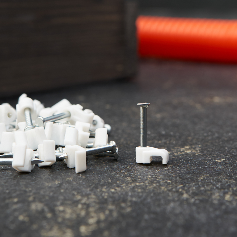 Плоский крепеж 4х2 мм с гвоздем предназначен для фиксации плоского кабеля к деревянной поверхности. Такой крепеж будет особенно полезен для использования на даче или в частном деревянном доме.