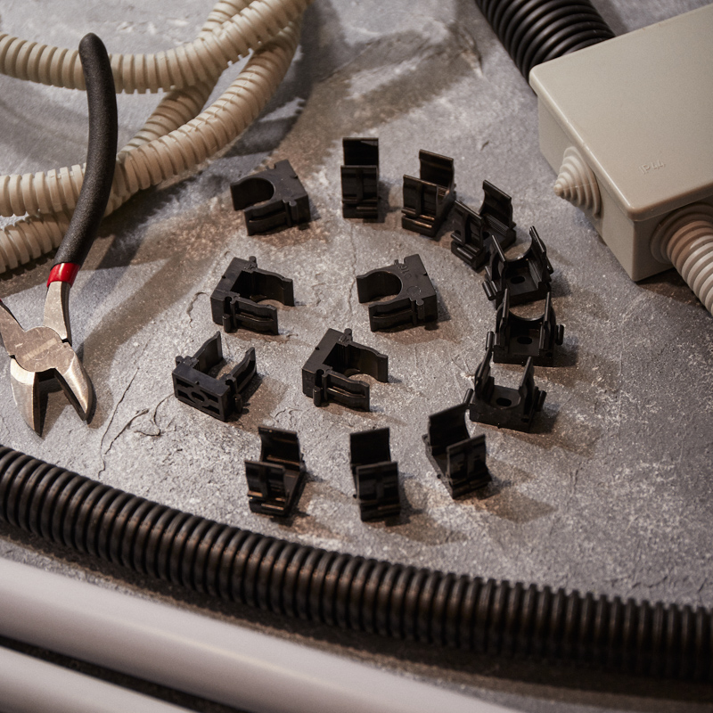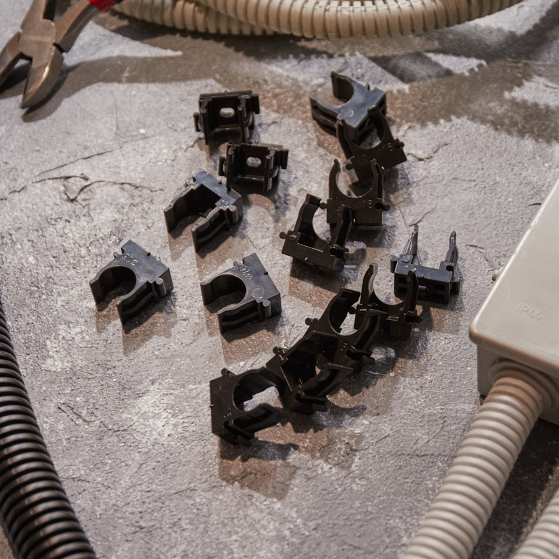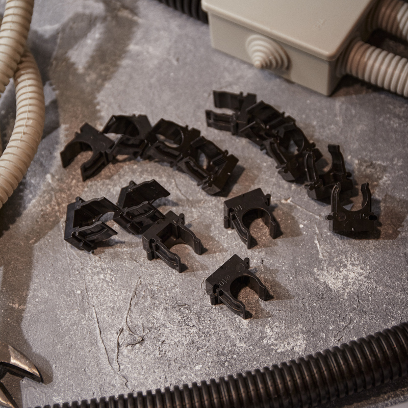 Изделие оснащено фиксаторами типа "шип-паз": при установке возможно соединять крепежи-клипсы различных диаметров.
