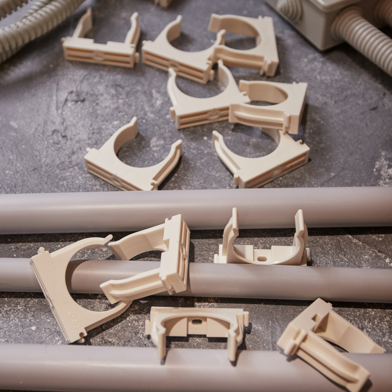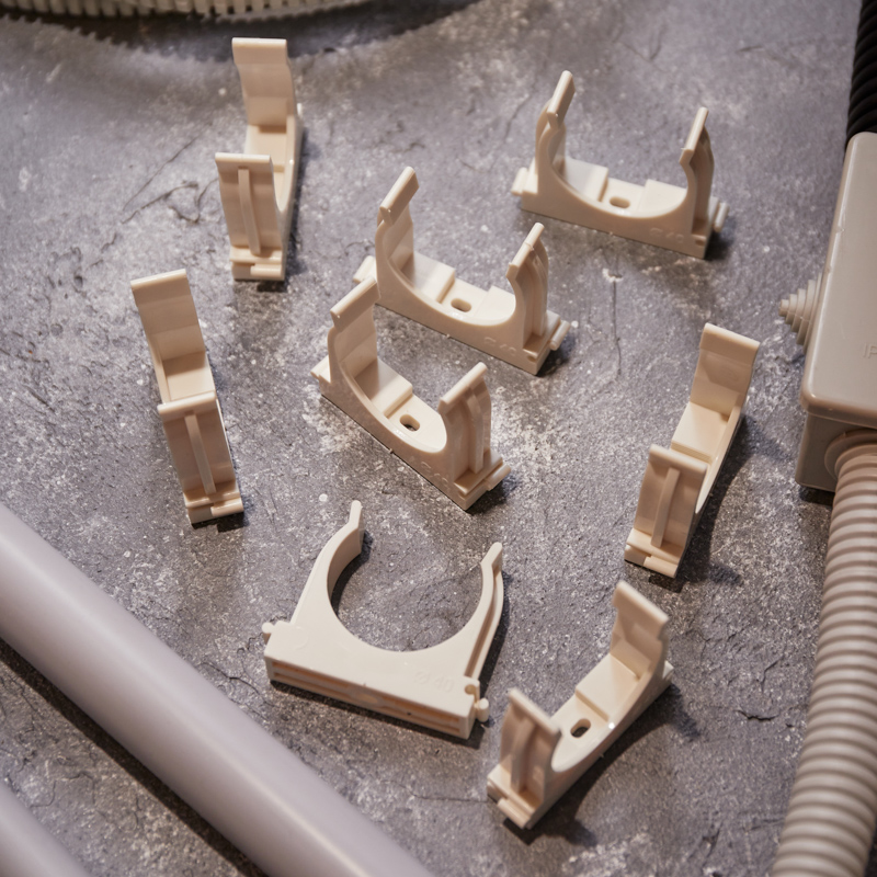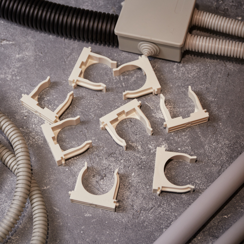 Изделие оснащено фиксаторами типа "шип-паз": при установке возможно соединять крепежи-клипсы различных диаметров.
