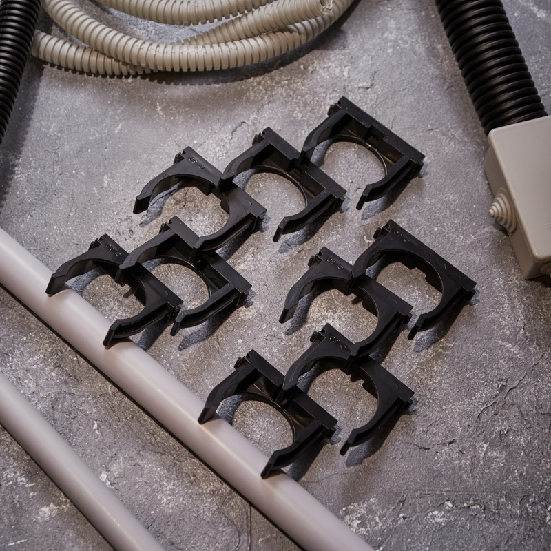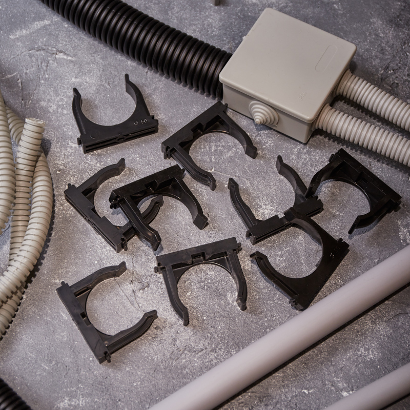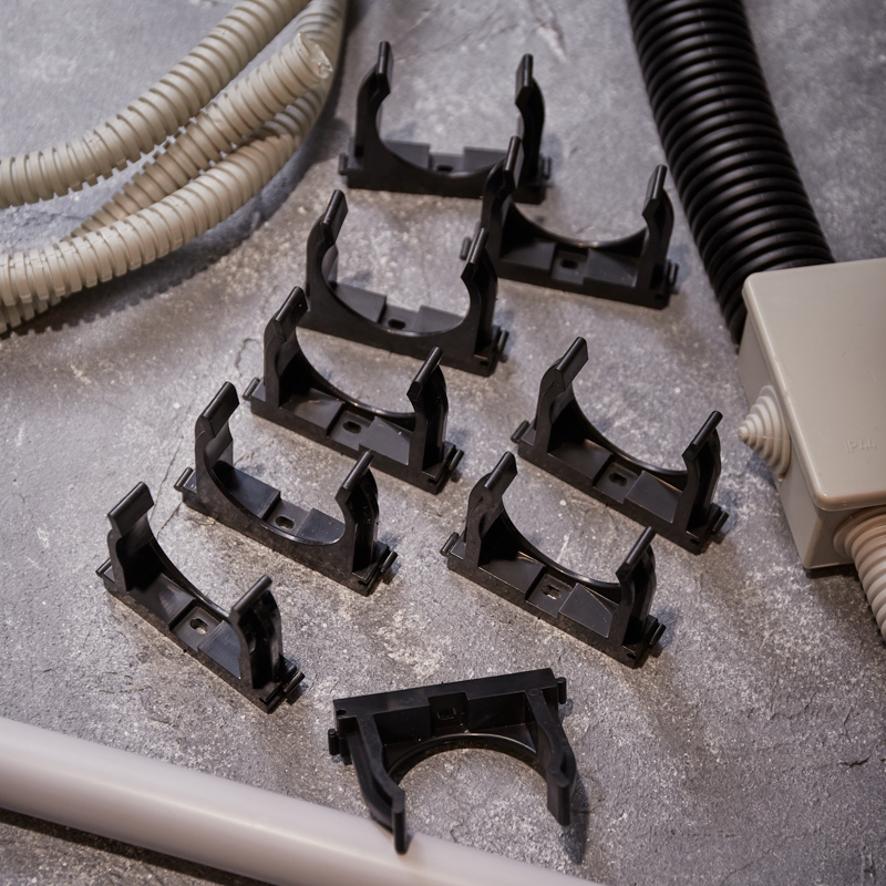 Изделие оснащено фиксаторами типа "шип-паз": при установке возможно соединять крепежи-клипсы различных диаметров.