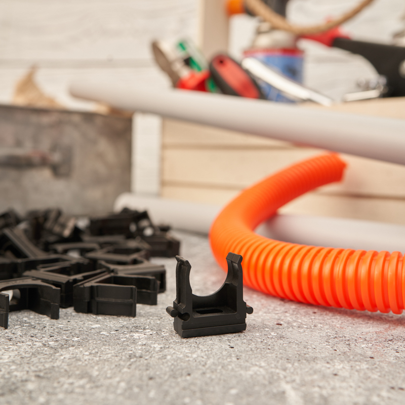 Крепеж для гофры, гофротрубы (клипса для гофротрубы), труб ПВХ и кабеля изготовлен из качественных материалов по передовым технологиям пластикового литья.