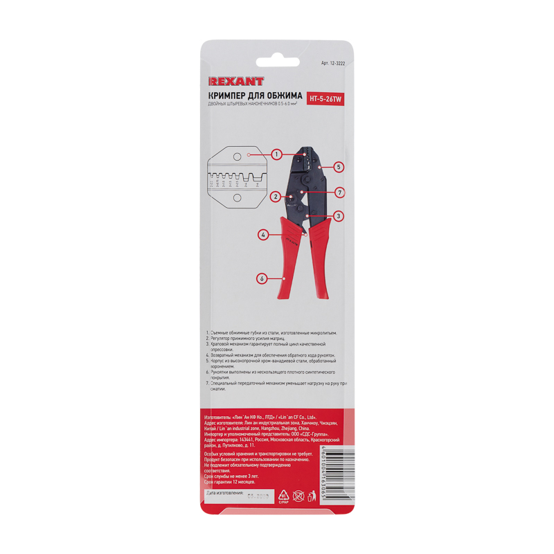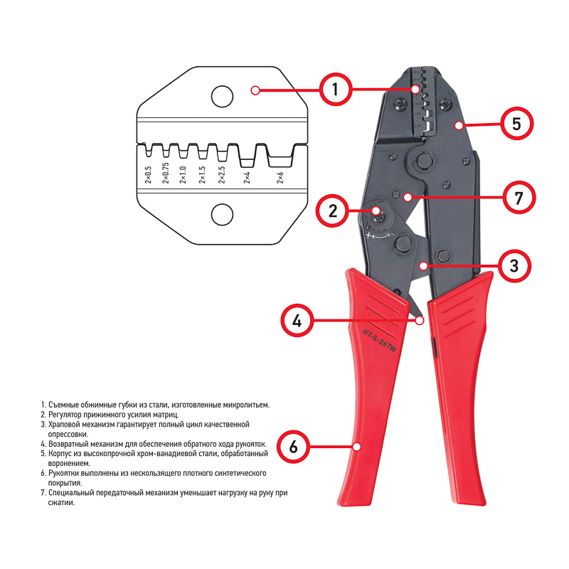 Корпус кримпера изготовлен из высокопрочной хром-ванадиевой стали с воронением, благодаря чему устойчив к механическим воздействиям и имеет продолжительный срок службы. Съемные обжимные губки изготовлены микролитьем и гарантируют точное соответствие размеру и форме клемм и контактов. Двухконтурная матрица позволяет совершать обжим как по изоляции, так и по жиле. Специальный регулятор позволяет контролировать прижимное усилие матриц. Также инструмент оснащен передаточным механизмом, который уменьшает нагрузку на руку при сведении рукояток и возвратным механизмом для упрощенного процесса работы с инструментом. Храповой механизм производит полный цикл качественной опрессовки. Однокомпонентные защитные рукоятки выполнены из плотного нескользящего синтетического материала, который делает работу с инструментом легкой и приятной.