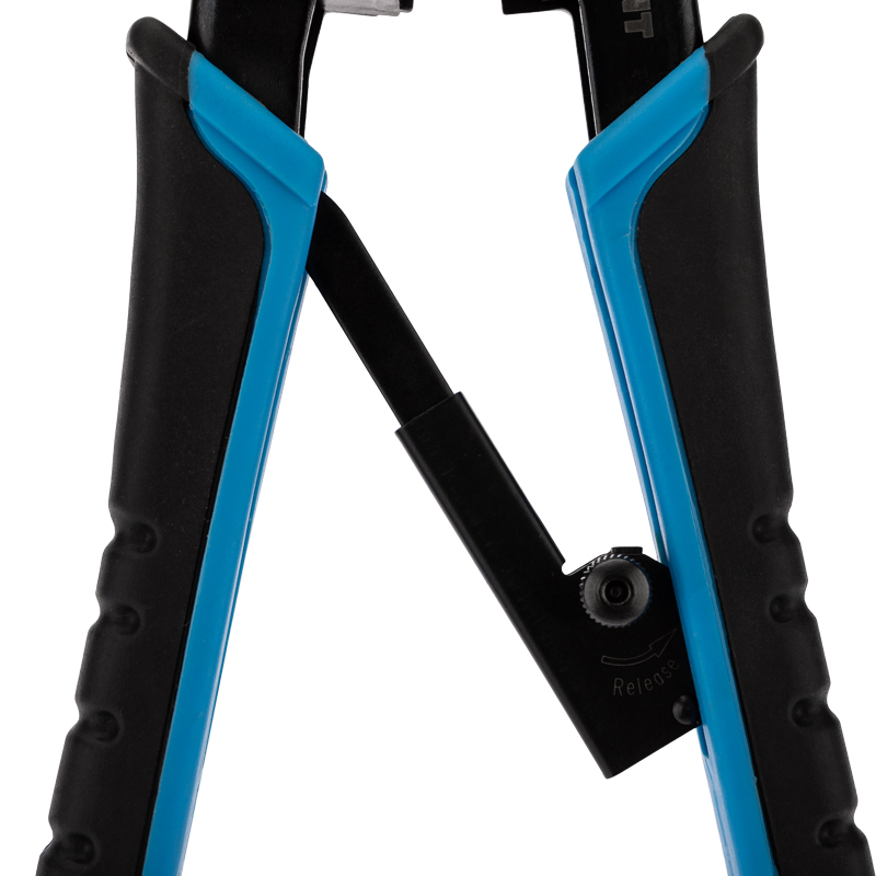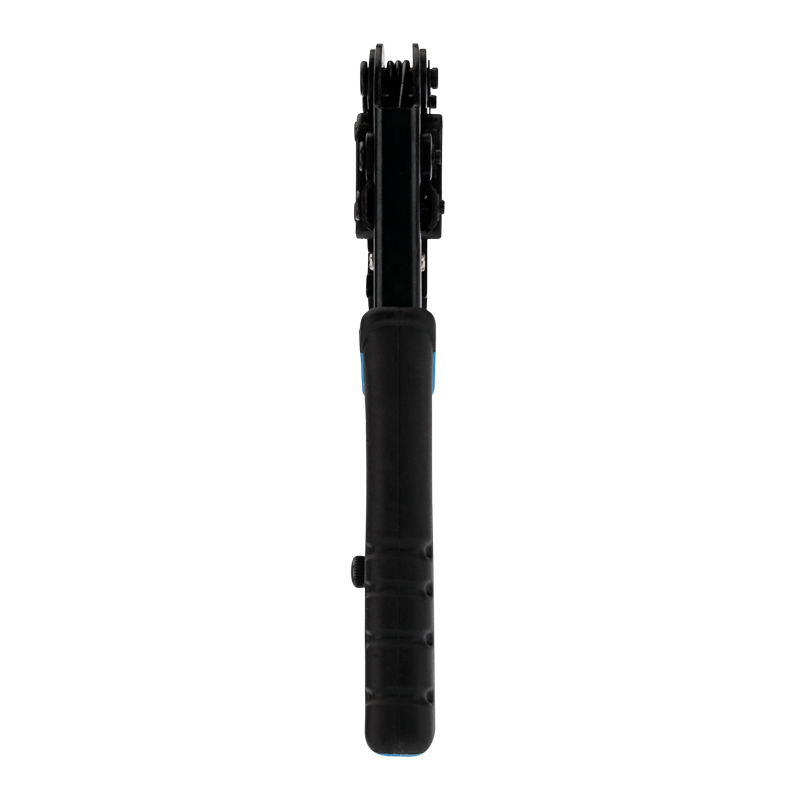 Корпус кримпера изготовлен из высокопрочной хром-ванадиевой стали с воронением, благодаря чему устойчив к механическим воздействиям и имеет продолжительный срок службы. Обладает дополнительными функциями обрезки проводов и снятия изоляции с плоских и круглых кабелей. Режущие сегменты закругленной формы надежно обхватывают кабель и обрезают его без деформаций и скосов, а для большего удобства предусмотрена функция быстрой разблокировки лезвий после обрезки. Оснащен возвратным механизмом, который обеспечивает обратный ход рукояток и упрощает процесс работы с инструментом. Храповой механизм производит полный цикл качественной опрессовки. Двухкомпонентные защитные рукоятки выполнены из плотного нескользящего синтетического материала, который делает работу с инструментом легкой и приятной.