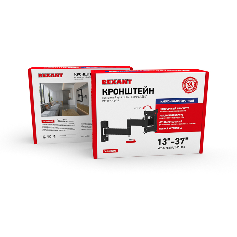 Кронштейн REXANT серии HOME используется для крепления LED, LCD, PLASMA телевизоров 13"- 37"дюймов к стене. Оснащен наклонно-поворотным механизмом (с 2 коленами), который позволяет свободно регулировать положение телевизора, что обеспечивает комфортный и удобный просмотр вне зависимости от Вашего расположения в комнате. В любой момент телевизор можно повернуть в нужную Вам сторону, выставить необходимый угол наклона и избежать бликов при смене освещения. Конструкция механизма позволяет точно и надежно фиксировать заданное положение с максимальной точностью.