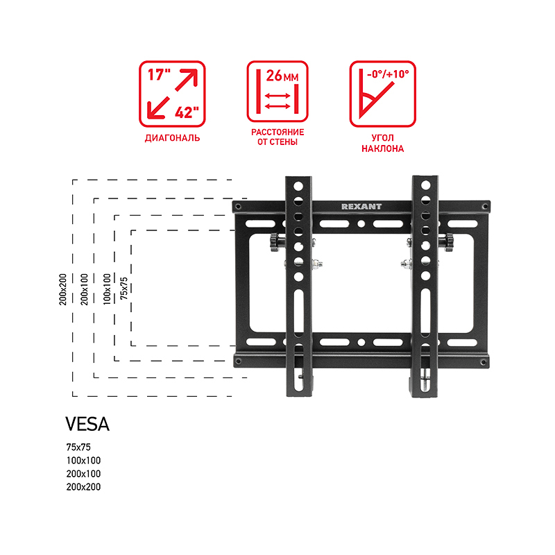 Поддержка крепления стандарта VESA: 50x50/75x75/100x100/200x200 мм.