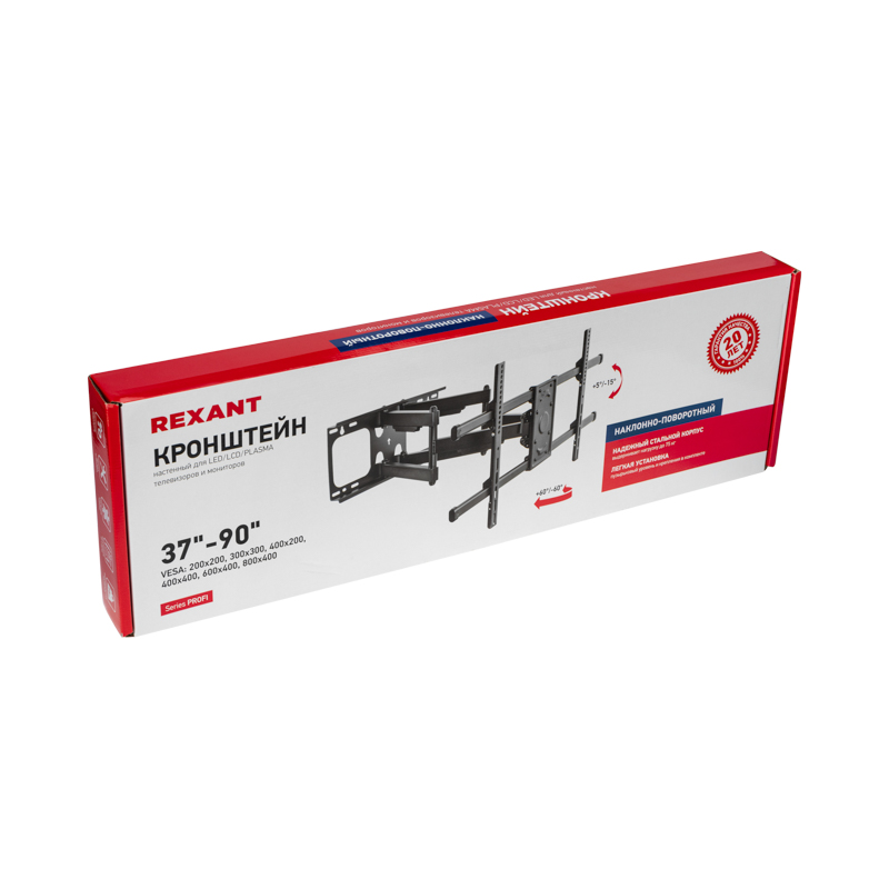 Кронштейн REXANT серии Profi используется для крепления LED, LCD, PLASMA телевизоров 37"- 90" дюймов к стене. Оснащен наклонно-поворотным механизмом (с двойным коленом), который позволяет свободно регулировать положение телевизора, что обеспечивает комфортный и удобный просмотр вне зависимости от Вашего расположения в комнате. В любой момент телевизор можно повернуть в нужную Вам сторону, выставить необходимый угол наклона и избежать бликов при смене освещения. Конструкция механизма позволяет точно и надежно фиксировать заданное положение с максимальной точностью.