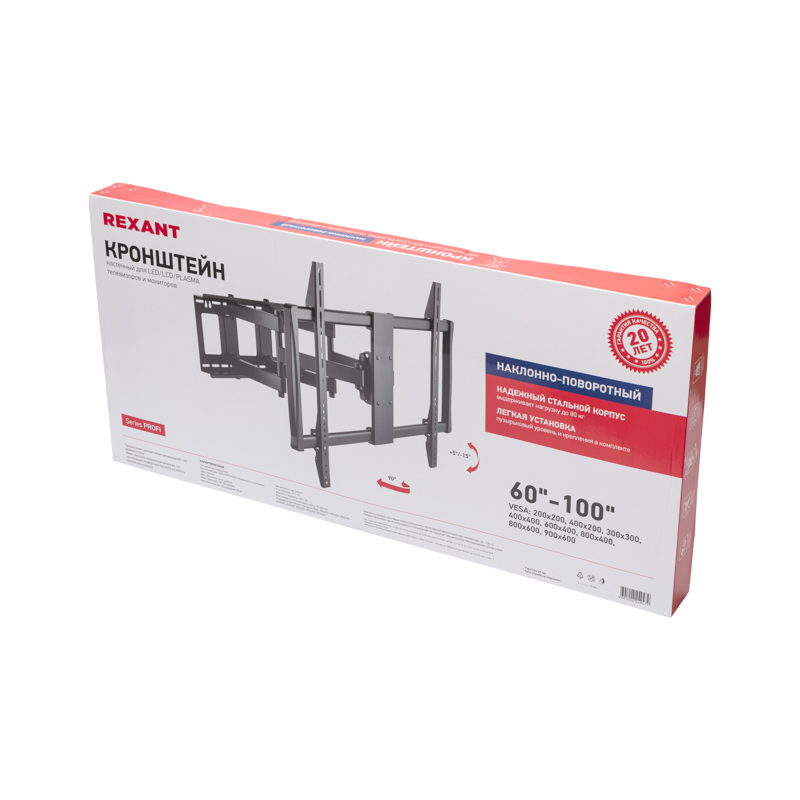 Кронштейн REXANT серии Profi используется для крепления LED, LCD, PLASMA телевизоров 60"- 100" дюймов к стене. Оснащен наклонно-поворотным механизмом (с двойным коленом), который позволяет свободно регулировать положение телевизора, что обеспечивает комфортный и удобный просмотр вне зависимости от Вашего расположения в комнате. В любой момент телевизор можно повернуть в нужную Вам сторону, выставить необходимый угол наклона и избежать бликов при смене освещения. Конструкция механизма позволяет точно и надежно фиксировать заданное положение с максимальной точностью.
