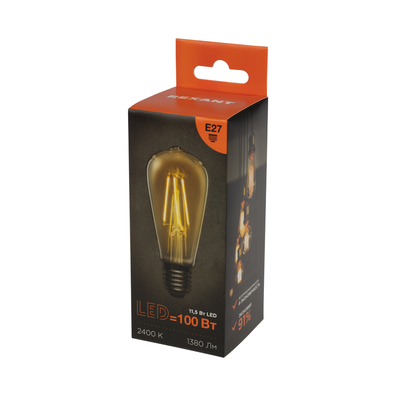 Филаментная лампа REXANT служит одновременно источником искусственного освещения и элементом декора. Используется для освещения комнат, домов, гостиниц, кафе, и других объектов.