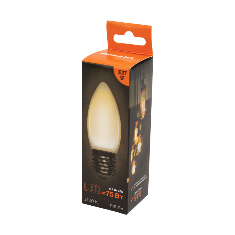 Лампа филаментная Свеча CN35 9,5Вт 915Лм 2700K E27 матовая колба REXANT