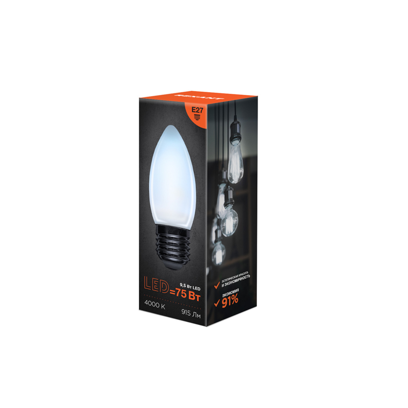 Филаментная лампа с матовой колбой имеет форму, имитирующую пламя свечи, за счет чего и получила свое название. Обеспечивает качественное основное и дизайнерское освещение различных помещений. За счет распространения света во всех направлениях имеет широкий угол освещения и может быть установлена любым способом.