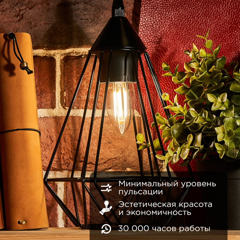 Филаментная лампа имеет форму, имитирующую пламя свечи, за счет чего и получила свое название. Обеспечивает качественное основное и дизайнерское освещение различных помещений. За счет распространения света во всех направлениях имеет широкий угол освещения и может быть установлена любым способом.