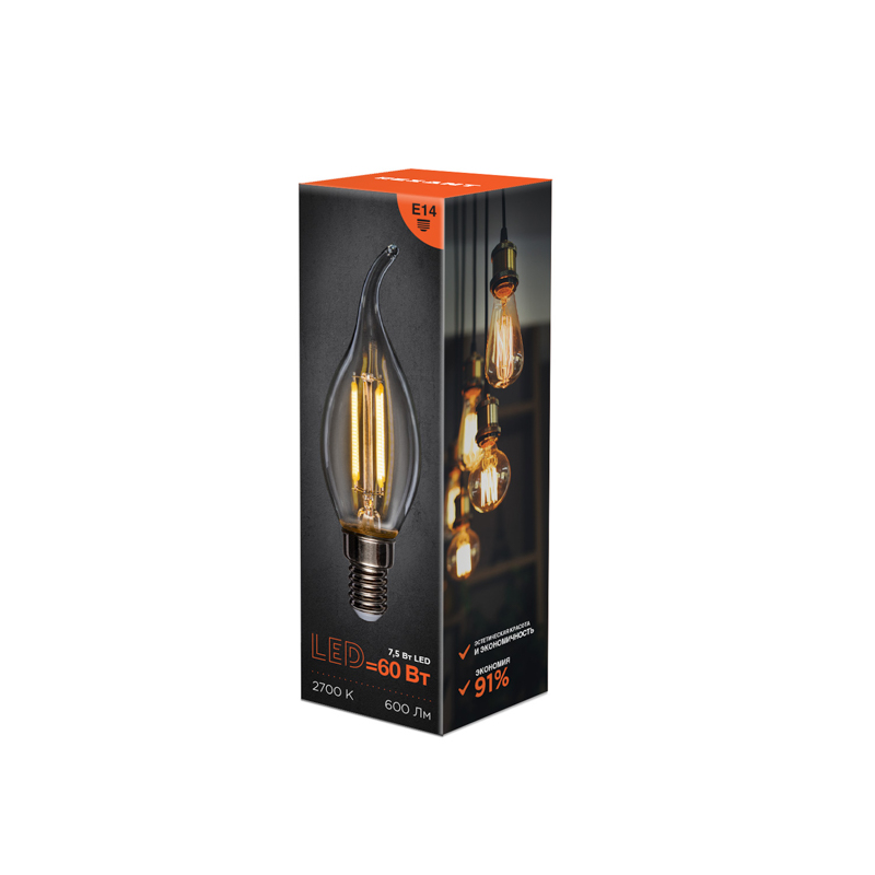 Филаментная лампа обладает характерной вытянутой формой с заостренным кончиком, напоминающим язык пламени на ветру. Имеет прозрачную колбу, которая пропускает больше света и обеспечивает высокую яркость. Мощность – 7,5Вт, цоколь – Е14.