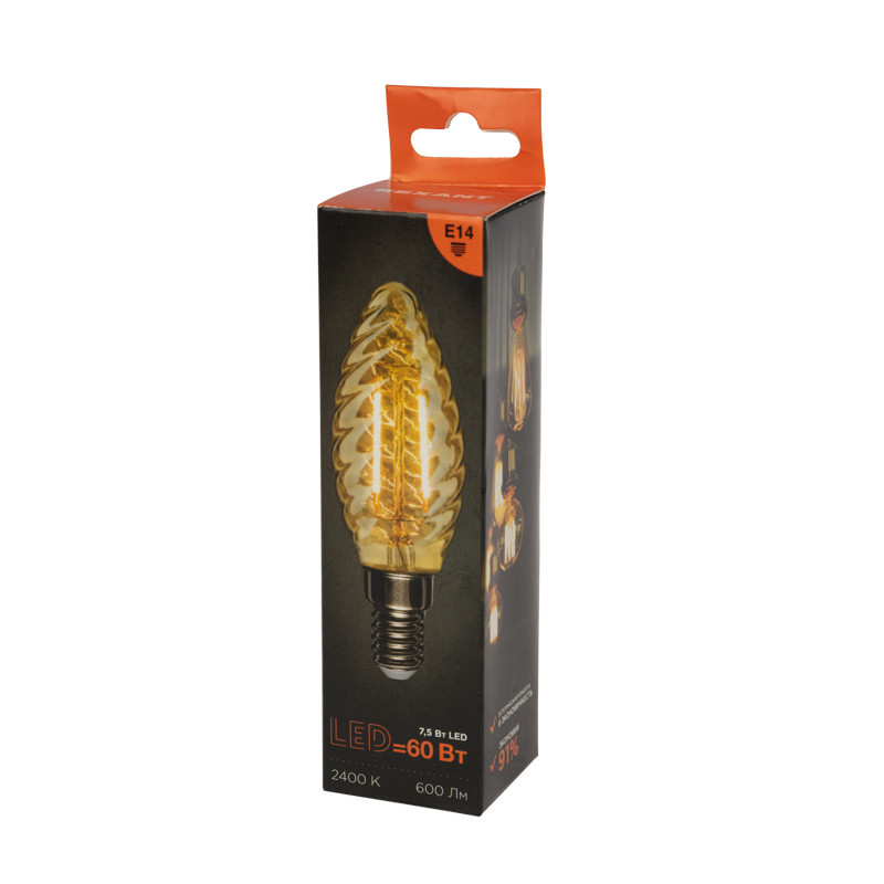Филаментная лампа мощностью 7,5Вт с цоколь Е14 обладает вытянутой колбой с витой поверхностью стекла. Используется для освещения комнат, домов, гостиниц, кафе, и других объектов.