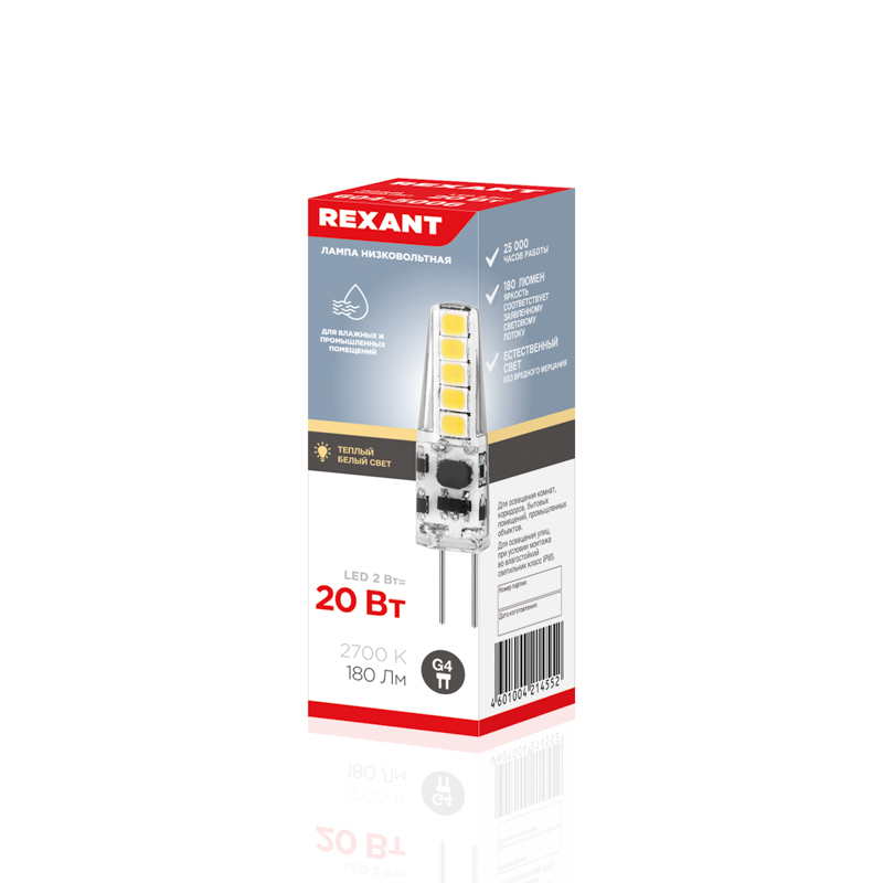 Мощность лампы составляет 2Вт. Цоколь – G4. Цвет свечения – теплый.