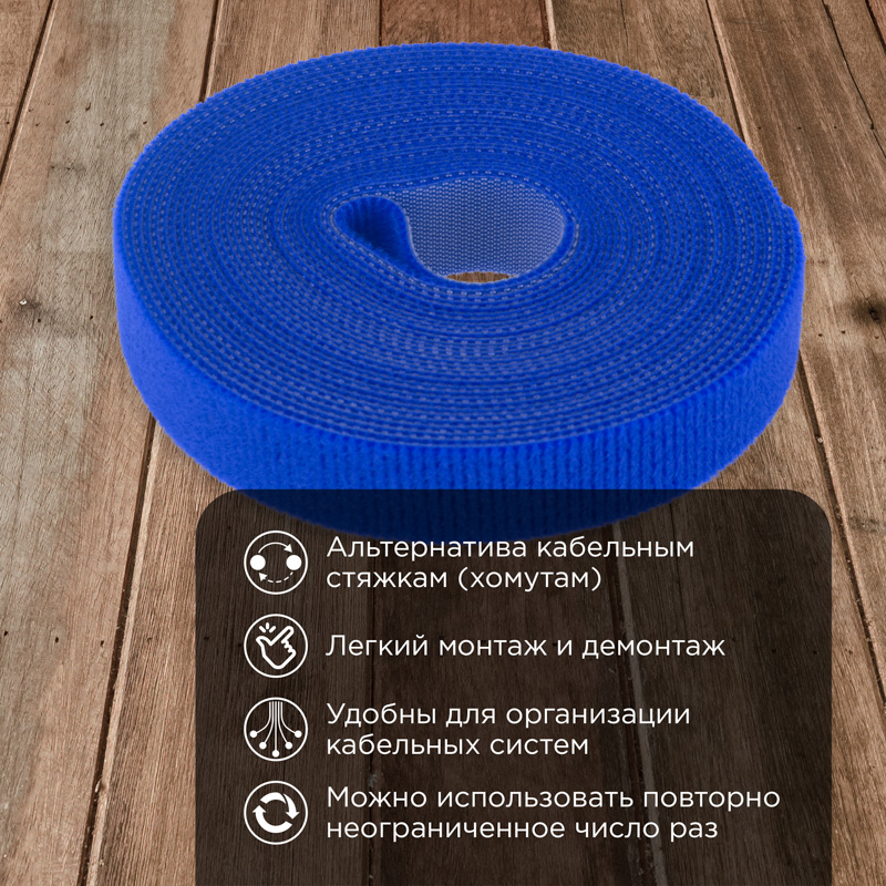 Лента представляет собой синюю нейлоновую полосу с крючками с одной стороны и петлями с другой. Такая конструкция стяжки предполагает многократное использование. Петли и крючки расположены по всей длине ленты, благодаря чему ее можно использовать в любом направлении.