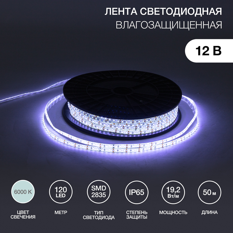 Лента светодиодная 12В, SMD2835, 19,2 Вт/м, 120 LED/м, 6000К, 10мм, 50м, IP65 LAMPER