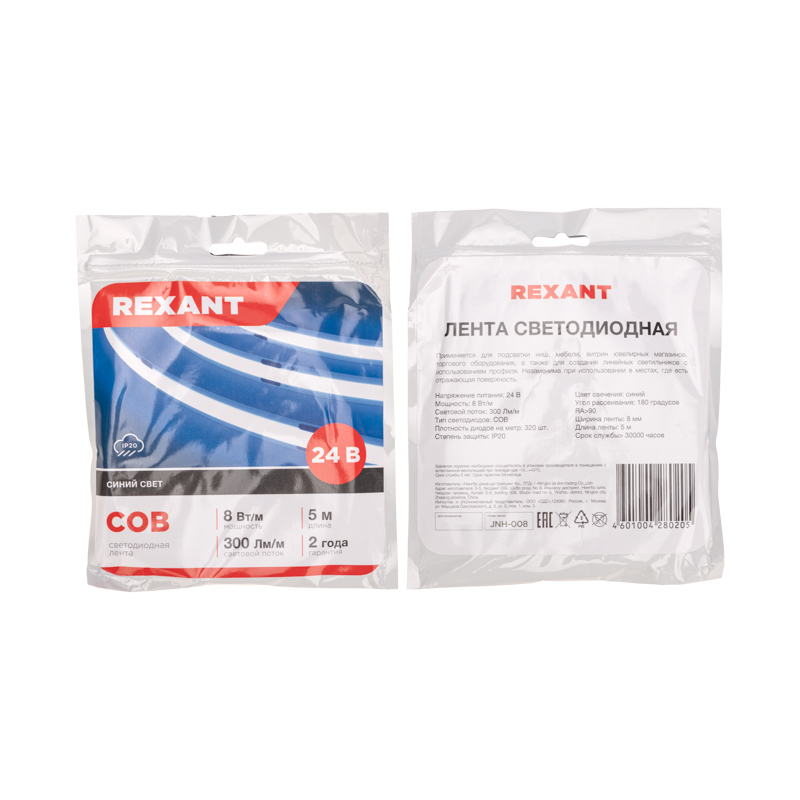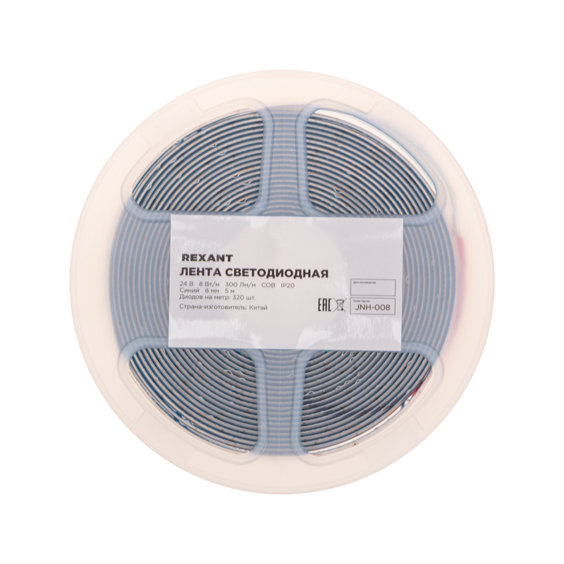 Лента светодиодная 24В, COB 8Вт/м, 320 LED/м, синий, 8мм, 5м, IP20 REXANT