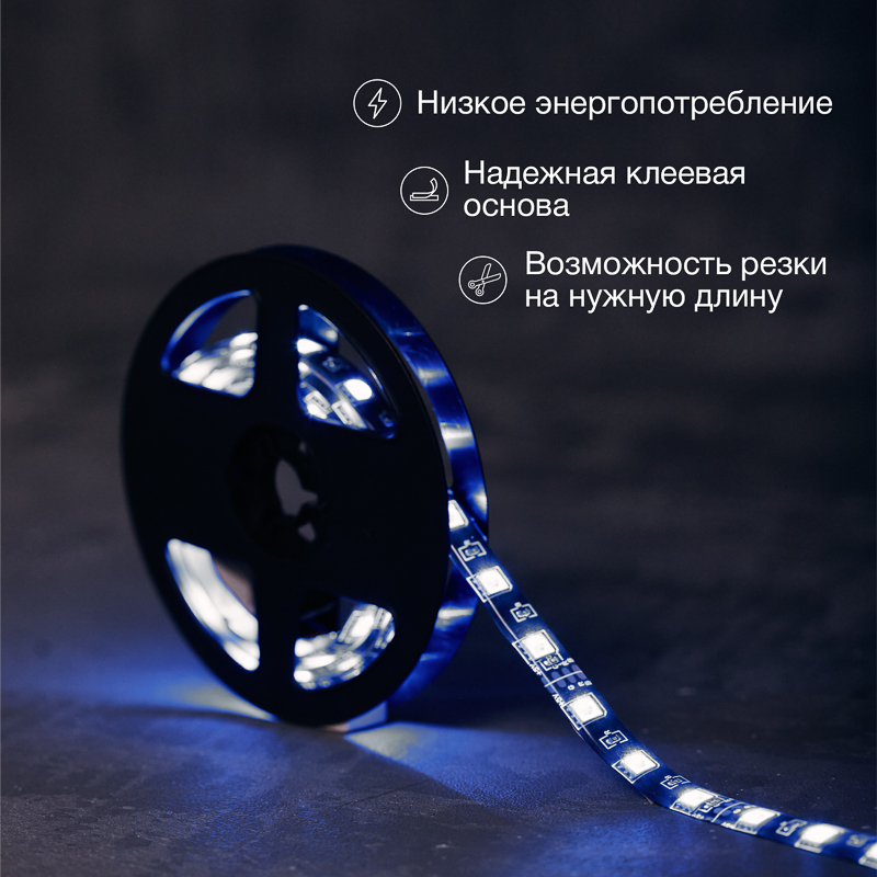 Лента работает от напряжения 5 В и не нагревается во время эксплуатации, что гарантирует безопасность использования.