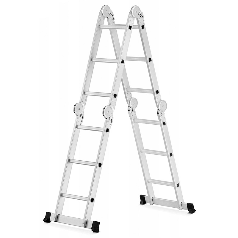 Алюминиевая лестница-трансформер повышенной прочности при небольшом весе обладает надежностью и высоким уровнем удобства во время использования. Большим преимуществом таких лестниц-трансформеров является количество возможных позиций, в которых их можно использовать и компактность, которая облегчает их перемещение и транспортировку. Регулировка производится при помощи стальных шарниров, которые обеспечивают надежную автоматическую фиксацию выбранного положения лестницы. Изделие оснащено противоскользящими рельефными ступенями, что гарантирует безопасность во время использования.