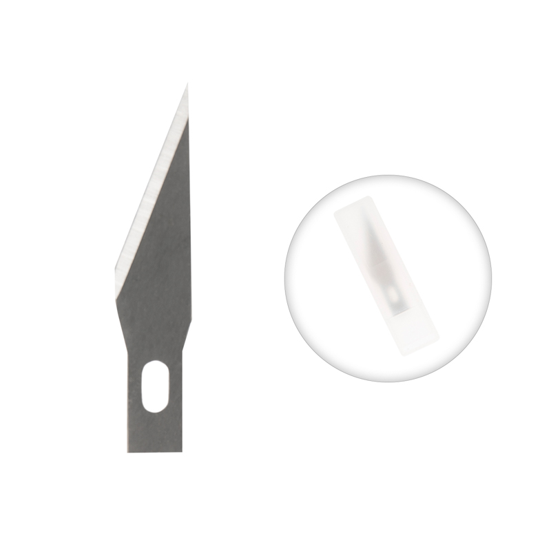 Комплект сменных лезвий для ножей. Применяется для фигурного вырезания, аппликаций, разрезания бумаги, пленок, обоев, кожи и других видов работ. Рекомендуется для использования в качестве сменного лезвия с ножами для художественных работ.