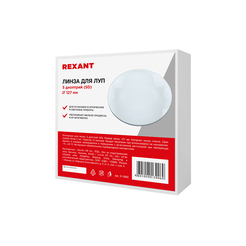 Линза представляет собой оптический прибор, предназначенный для визуального увеличения рисунков, текстов, объектов и их фрагментов. Такая линза устанавливается в лупы и другие оптические и световые приборы, которые используются в косметологии, ногтевом сервисе, ювелирном деле и т.д. При помощи устройства можно с удобством прочитать мелкий шрифт, рассмотреть детали картин, структуру тканей, ювелирные изделия, механизмы часов и т.д. Линза, выполненная из стекла, позволяет получить четкое изображение без искажений. Диаметр линзы - 127мм.