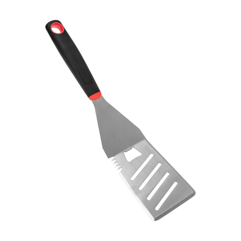 Лопатка для гриля СОКОЛ длиной 38 см имеет широкий функционал. Позволяет переворачивать еду, открывать бутылки, а с помощью зубчиков на одной из сторон – отбивать стейк.
