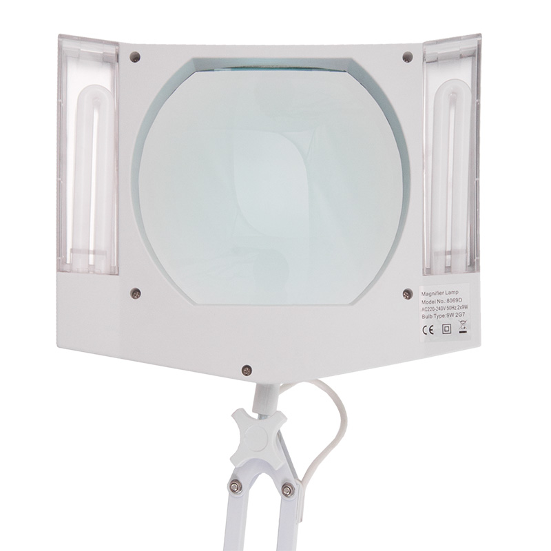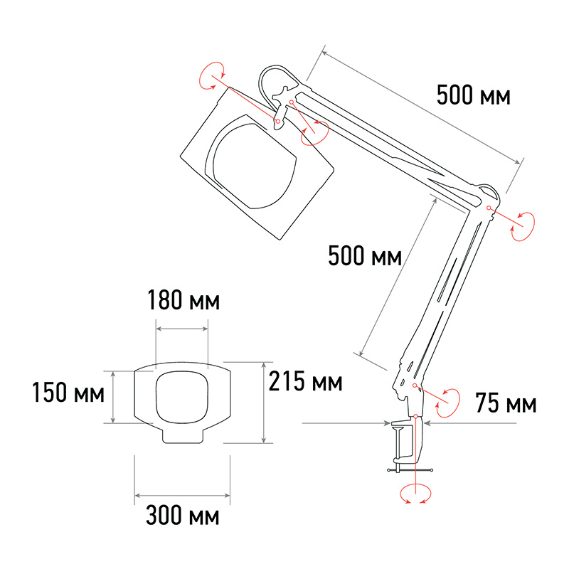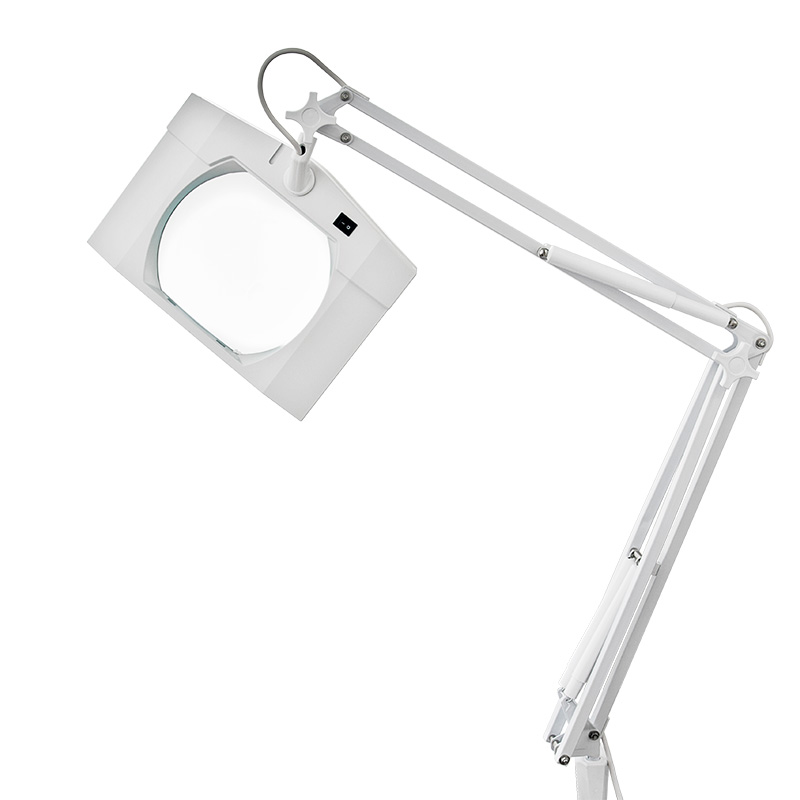 Линза, изготовленная из стекла, предоставляет наиболее четкое изображение с минимальным уровнем искажения. Удобный пантографический механизм, состоящий из звеньев, обеспечивает хорошую устойчивость в пространстве в необходимом положении. Рабочий радиус регулировки достигает 100 см. Струбциною крепление позволяет надежно зафиксировать изделие. Оптическая сила линзы – 3 диоптрии, что обеспечивает увеличение в 1,75 раза. Размер линзы: 150х180мм.