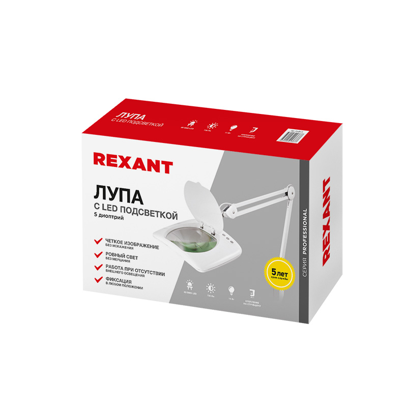 Лупа на струбцине квадратная настольная 5D с подсветкой REXANT предназначена для визуального увеличения различных мелких предметов или их фрагментов. Используется в косметологии, в тату-салонах, в биологии и медицине, в швейном и вышивальном деле, при выполнении ювелирных и радиомонтажных работ, ремонте часов, а также для организации труда людей со слабым зрением.