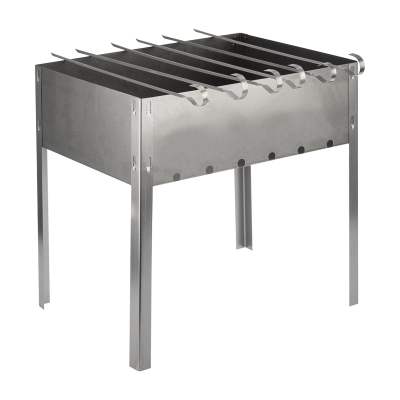 Общая высота ножек 350 мм оптимальна и удобна для приготовления шашлыков. Размеры жаровни 350х250 мм позволяют разместить шампуры и получить порцию блюда, рассчитанную на небольшую компанию. Толщина стенки – 0,4 мм.