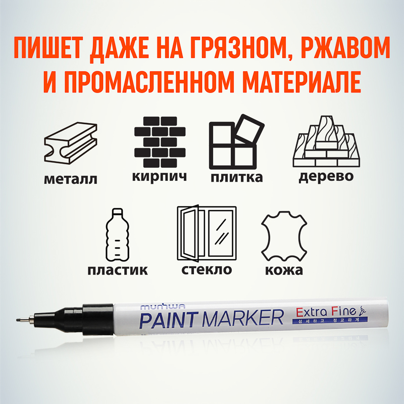 Водостойкий маркер-краска MunHwa «Extra Fine Paint Marker» лаковый на нитро-основе. Используется для маркировки изделий из: пластика, дерева, металла, камня, кирпича, стекла, резины, кожи. Применяется при реставрации, декорировании, ремонте и строительстве.
