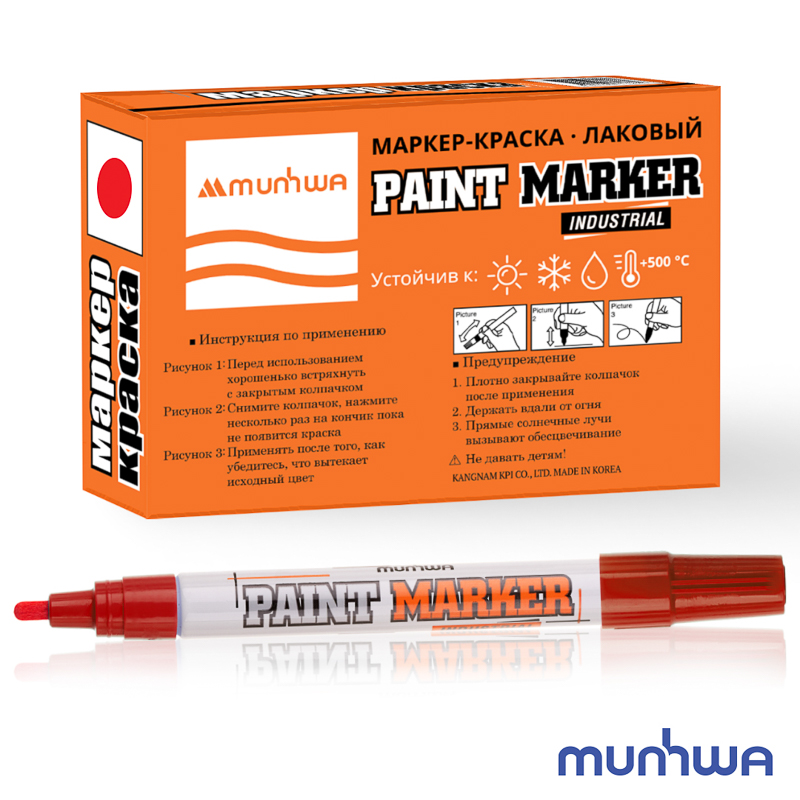 Маркер-краска MunHwa «Paint Marker» лаковый на нитро-основе. Используется для маркировки изделий из: пластика, дерева, металла, камня, кирпича, бетона, стекла, плитки, резины, кожи. Применяется при реставрации, декорировании, ремонте и строительстве. Чернила поступают дозированно, ровно ложатся на поверхность. Перед использованием необходимо встряхнуть маркер и в вертикальном положении надавить стержнем на поверхность: дать краске пропитать пишущий узел. Круглая форма наконечника не оставляет царапин при письме. Чернила высыхают на поверхности в течение 40-60 секунд. Корпус выполнен из прочного алюминия.