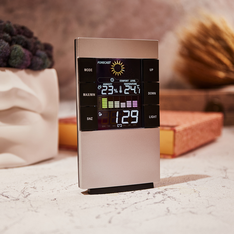 Изделие оснащено часами, календарем, будильником, а также функцией отображения прогноза погоды (солнечно, солнечно и облачно, облачно, дождливо), а также общего уровня метеокомфорта в помещении.
