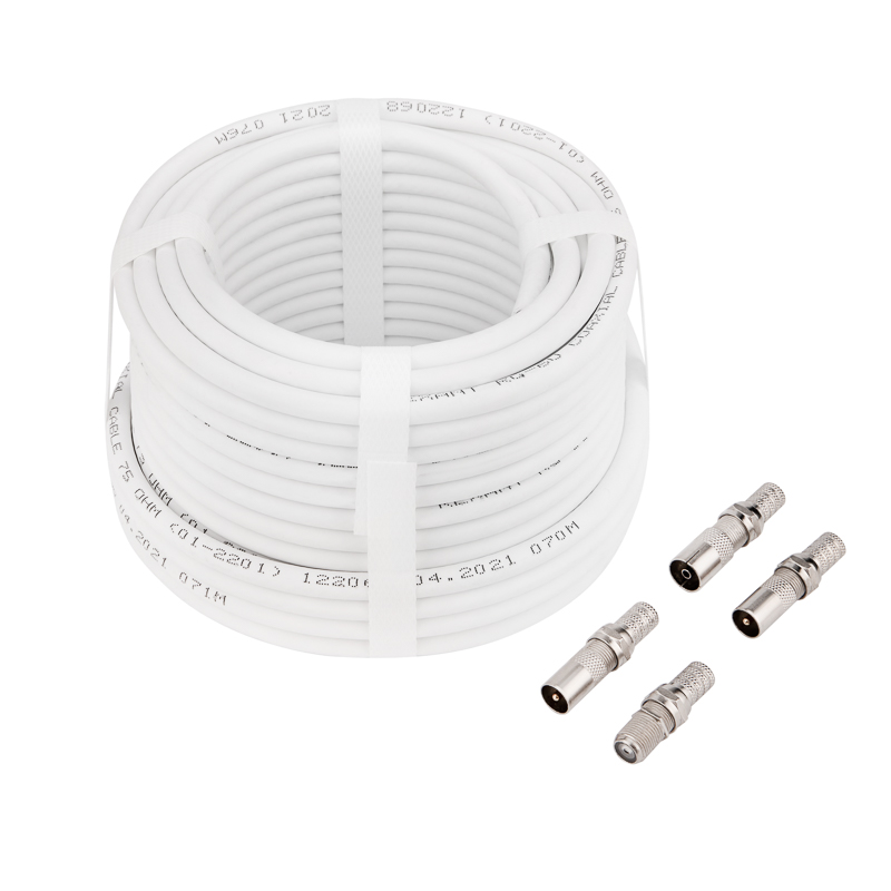 В состав комплекта входят: кабель RG-6 CCS 75Ом длиной 15 метров; F-разъем RG-6 – 4 шт; переходник (гнездо F - штекер TV) – 2 шт; переходник (гнездо F - гнездо TV) – 1 шт; переходник (гнездо F - гнездо F Бочка) – 1 шт.