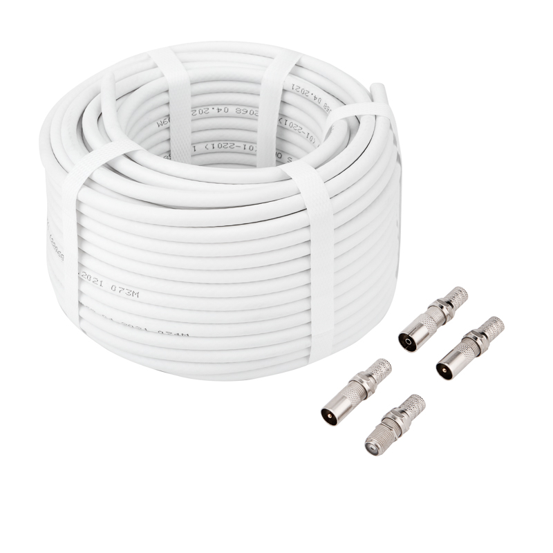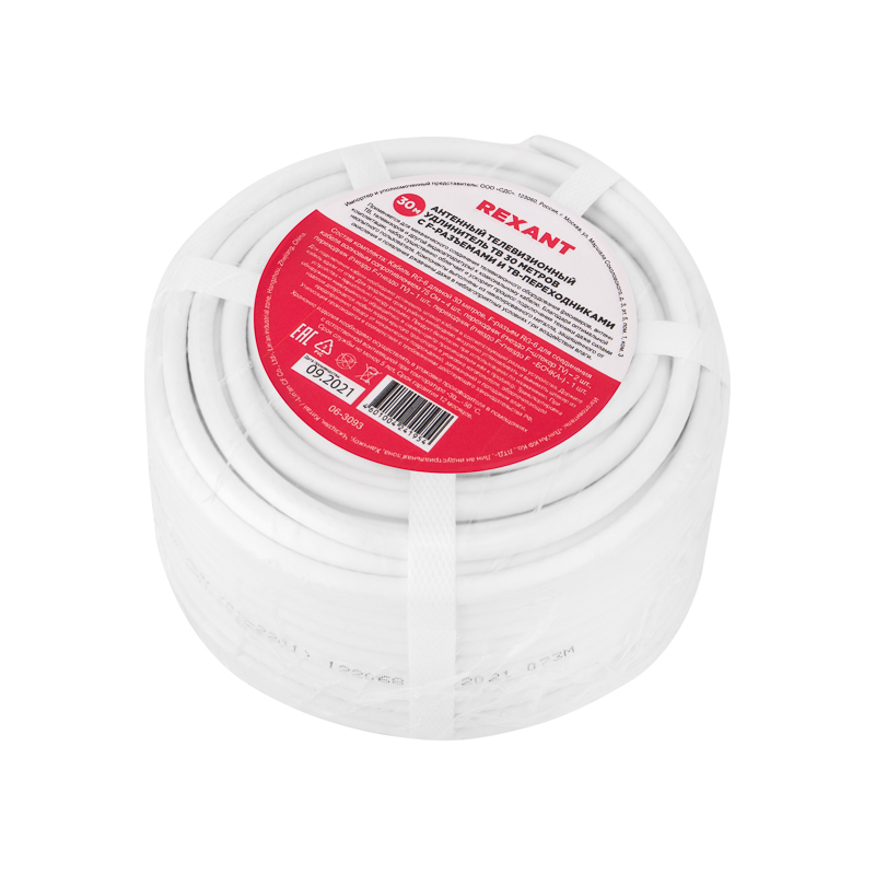 В состав комплекта входят: кабель RG-6 CCS 75Ом длиной 30 метров; F-разъем RG-6 – 4 шт; переходник (гнездо F - штекер TV) – 2 шт; переходник (гнездо F - гнездо TV) – 1 шт; переходник (гнездо F - гнездо F Бочка) – 1 шт.
