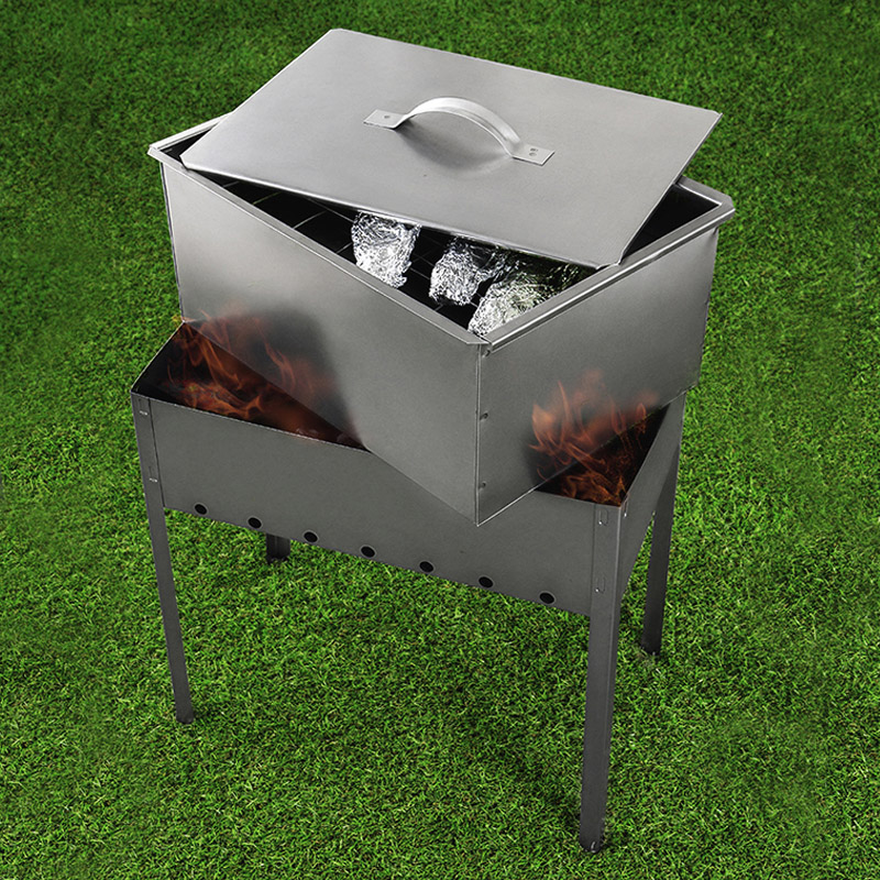 Универсальная двухуровневая коптильня представляет собой емкость с двумя металлическими решетками. Изделие надежно и герметично закрывается крышкой.
