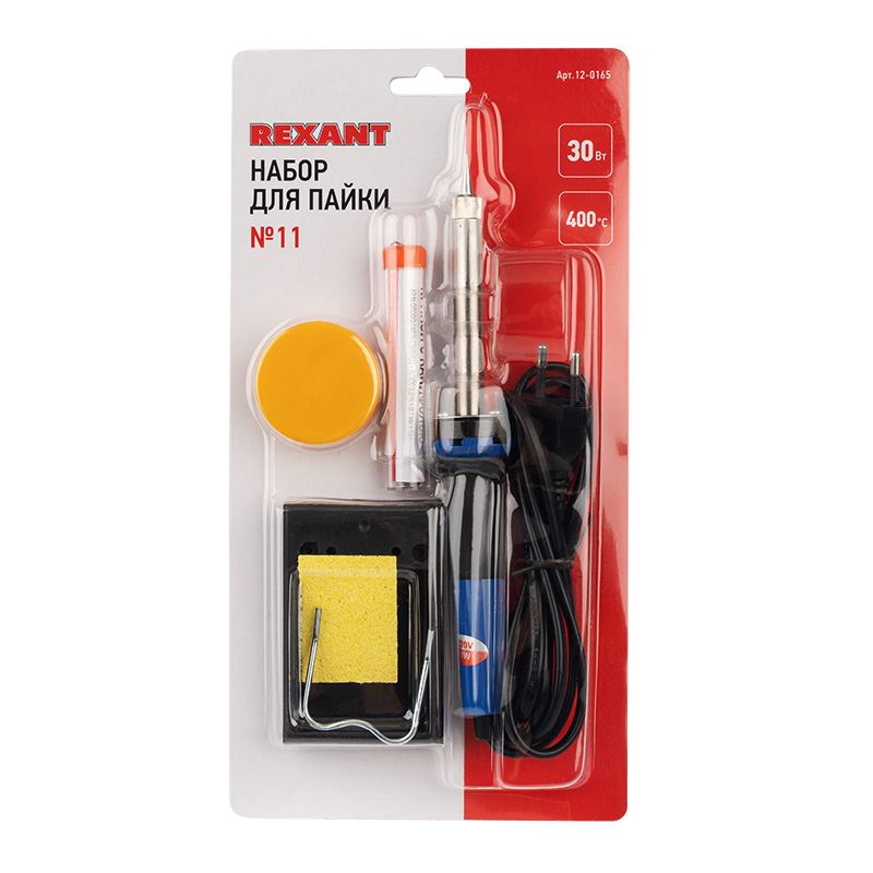 Набор для пайки № 11 (паяльник 30 Вт, подставка, губка для удаления припоя, канифоль, припой) REXANT позволит эффективно, быстро и самостоятельно отремонтировать электротехнику или произвести монтаж оборудования.