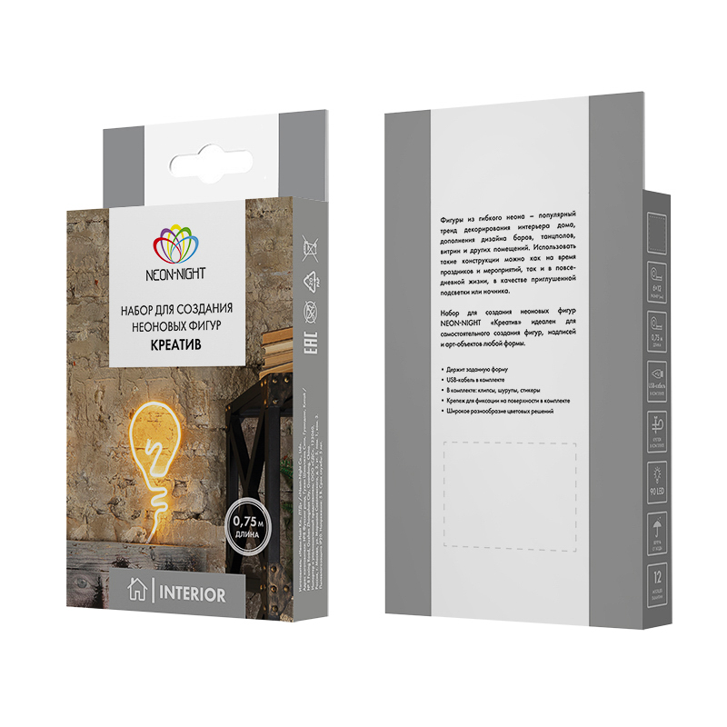 Набор для создания неоновых фигур «Креатив» предоставляет огромный простор для проявления фантазии в области декорирования интерьера. Украшения из гибкого неона стали настоящим трендом, и это оправдано: возможность создать уникальный арт-объект в комплексе с безопасностью продукции, делают изделие одним из самых востребованных в области оформления помещений светотехникой. Набор станет прекрасным подарком для взрослых и детей. В комплект входят USB-кабель и все необходимое для монтажа.
