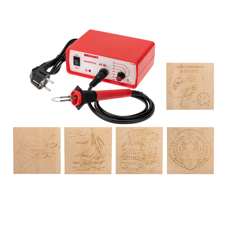 В набор для выжигания REXANT входит универсальный выжигательный прибор с функцией термоконтроля и комплект досок для выжигания с нанесенными силуэтами рисунков в количестве 5 штук.