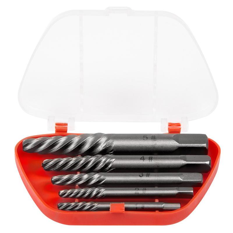Набор состоит из пяти экстракторов разных размеров, что позволяет использовать их для различных типов и размеров шурупов.
