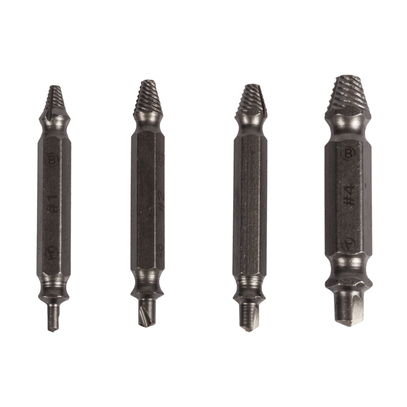 Набор состоит из четырех двухсторонних экстракторов. С одной стороны экстракторы имеют форму конусной спирали с левой резьбой, с другой стороны короткое сверло для засверливания отверстия. Такая конструктивная особенность упрощает работу с инструментом.