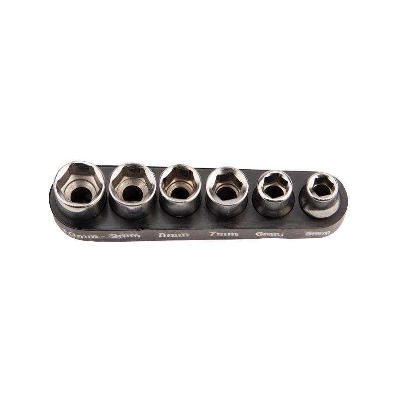 В наборе 6 съемных торцевых головок: 5,6,7,8,9,10 мм, которые имеют 6-гранный зев и посадочное место для присоединительного квадрата 1/4”. Твердость материала рабочей части головок: 55-58 HRС.