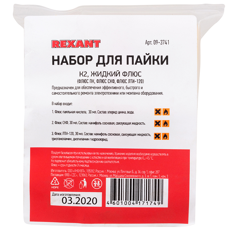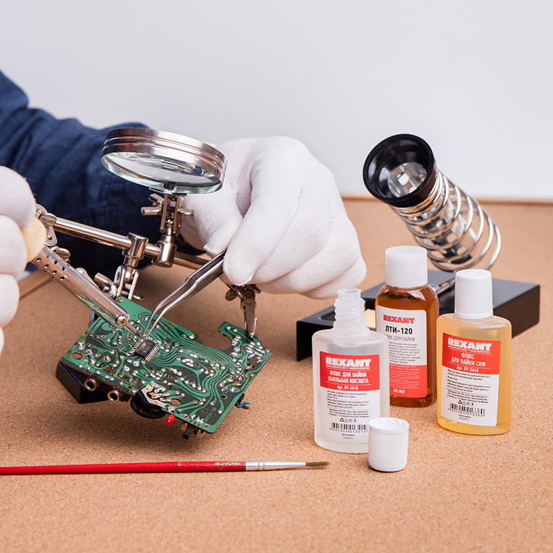 В набор входят следующие 3 предмета: флюс ПАЯЛЬНАЯ КИСЛОТА объемом 30 мл; флюс СКФ объемом 30 мл; флюс ЛТИ-120 объемом 30 мл.