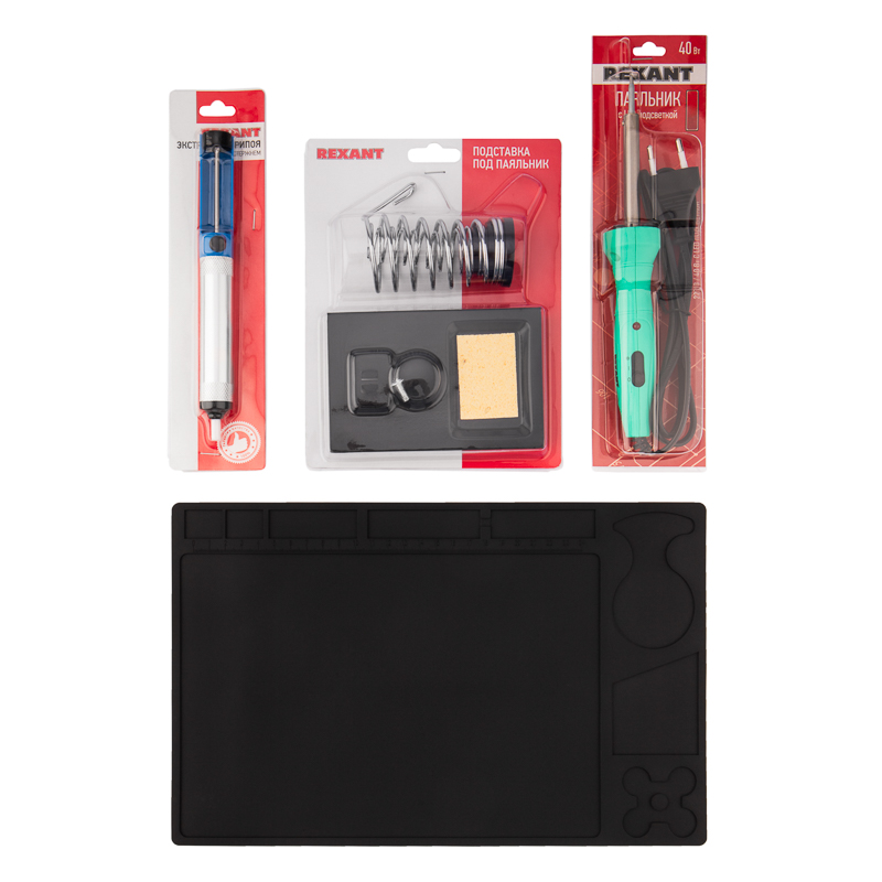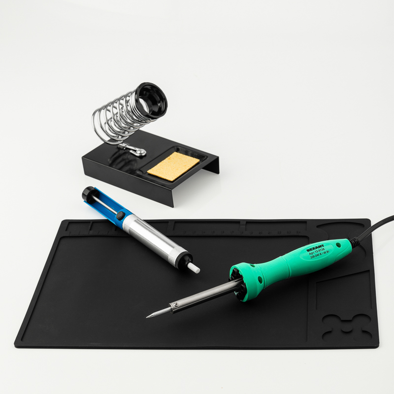 Безопасность и комфорт в процессе пайки обеспечивает антистатический коврик из силикона с отсеками для хранения мелких деталей (329х208х2,6 мм). При работе с термофеном коврик выдерживает температуру до 300°С, при прямом касании паяльника – до 230°С.