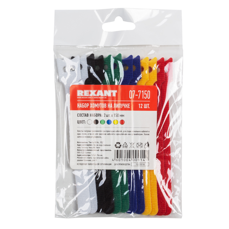 В упаковке поставляются 12 хомутов на липучке размером 150х12 мм белого, черного, зеленого, синего, желтого, красного цветов (по 2 шт). Это особенно удобно для маркировки проводов.
