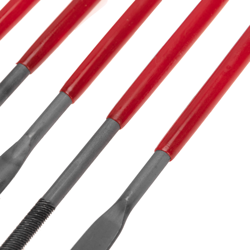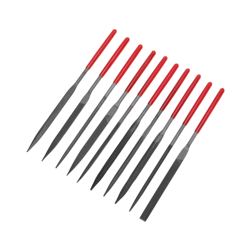 Набор комплектуется десятью надфилями – металлическими стержнями с насечками, которые предназначены для выполнения мелких слесарных работ, обработки металлов, пластмасс и других твердых материалов.