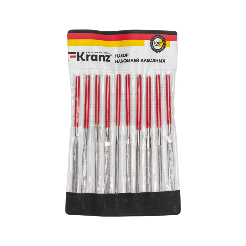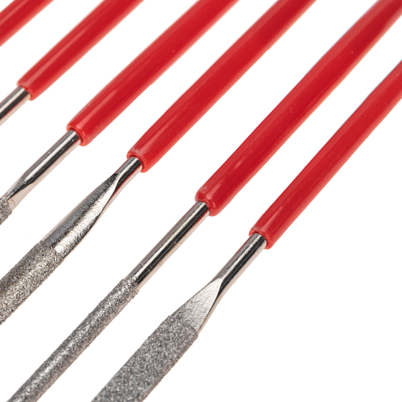 Набор комплектуется десятью надфилями с напылением из алмазной крошки, которые применяются для мелких слесарных работ с особо твердыми материалами: металлом, керамической плиткой, стеклом и др.