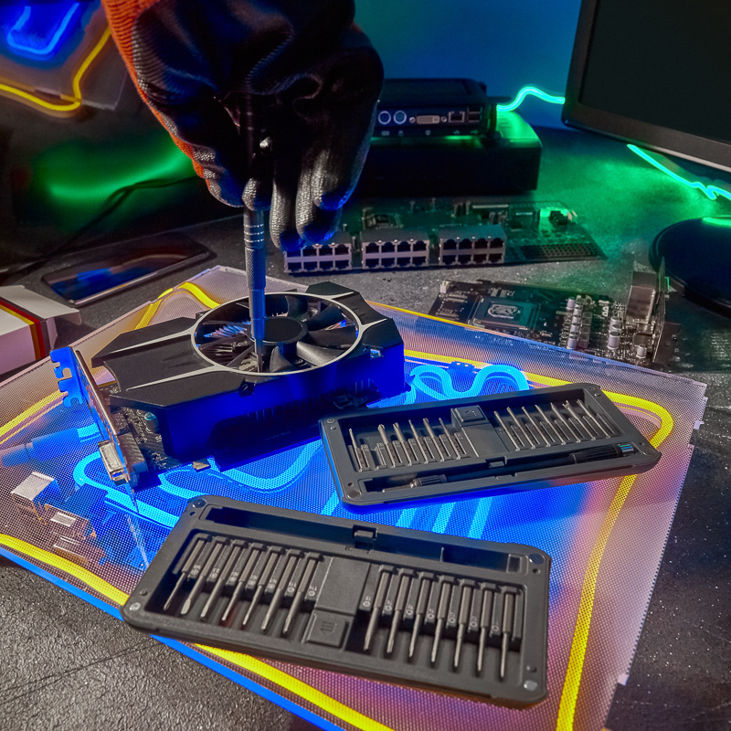 В наборе отвертка с 28 битами: 1.5, 2.0, 3.0, PH0, PH1, PH2, PH00, PH000, T1, T2, T3, T4, T5, TR6, TR8, TR10, TR15, H1.5, H2.0, H3.0, P2, P5, P6, U2.6, Y0.7, Y3, Triangle 2.3, Special PH2.5.